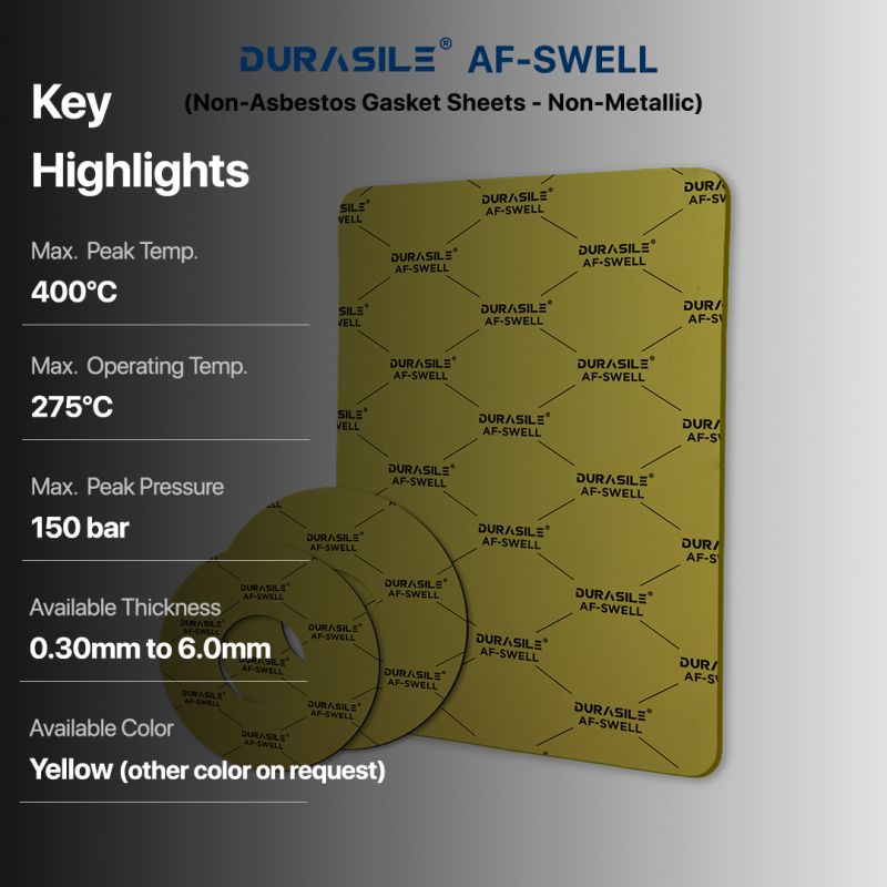 DURASILE AF-SWELL is manufactured from a carefully balanced blend of aramid and mineral fibres, reinforced and bonded with high-quality styrene-butadiene rubber (SBR). The sheets are produced using the hot calendering process under stringent quality controls in compliance with ISO 9001 certified systems.